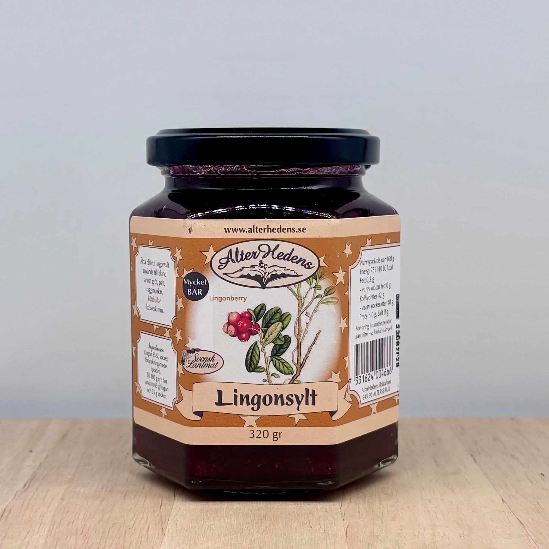 Lingonsylt från Alterhedens, rårörd med mycket bär. 320gIngredienser: Lingon 65%, socker, förtjockningsmedel (pektin). Till 100g sylt har använts 65g lingon och 35g socker.