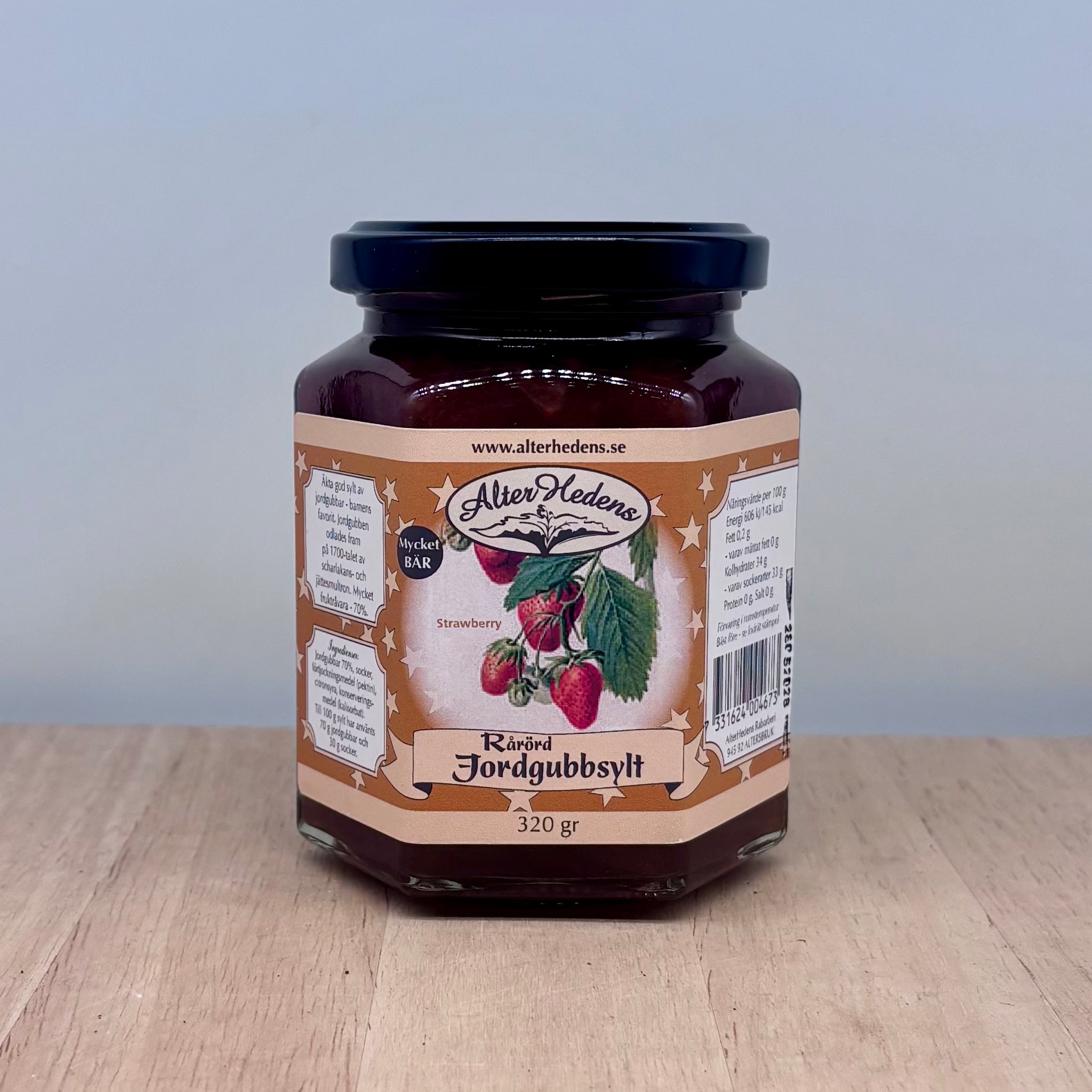 Rårörd jordgubbssylt från Alterhedens, 70% bär. 320gIngredienser: Jordgubbar 70%, socker, förtjockningsmedel (pektin), citronsyra, konserveringsmedel (kalisorbat). Till 100g sylt har använts 70g jordgubbar och 30g socker.