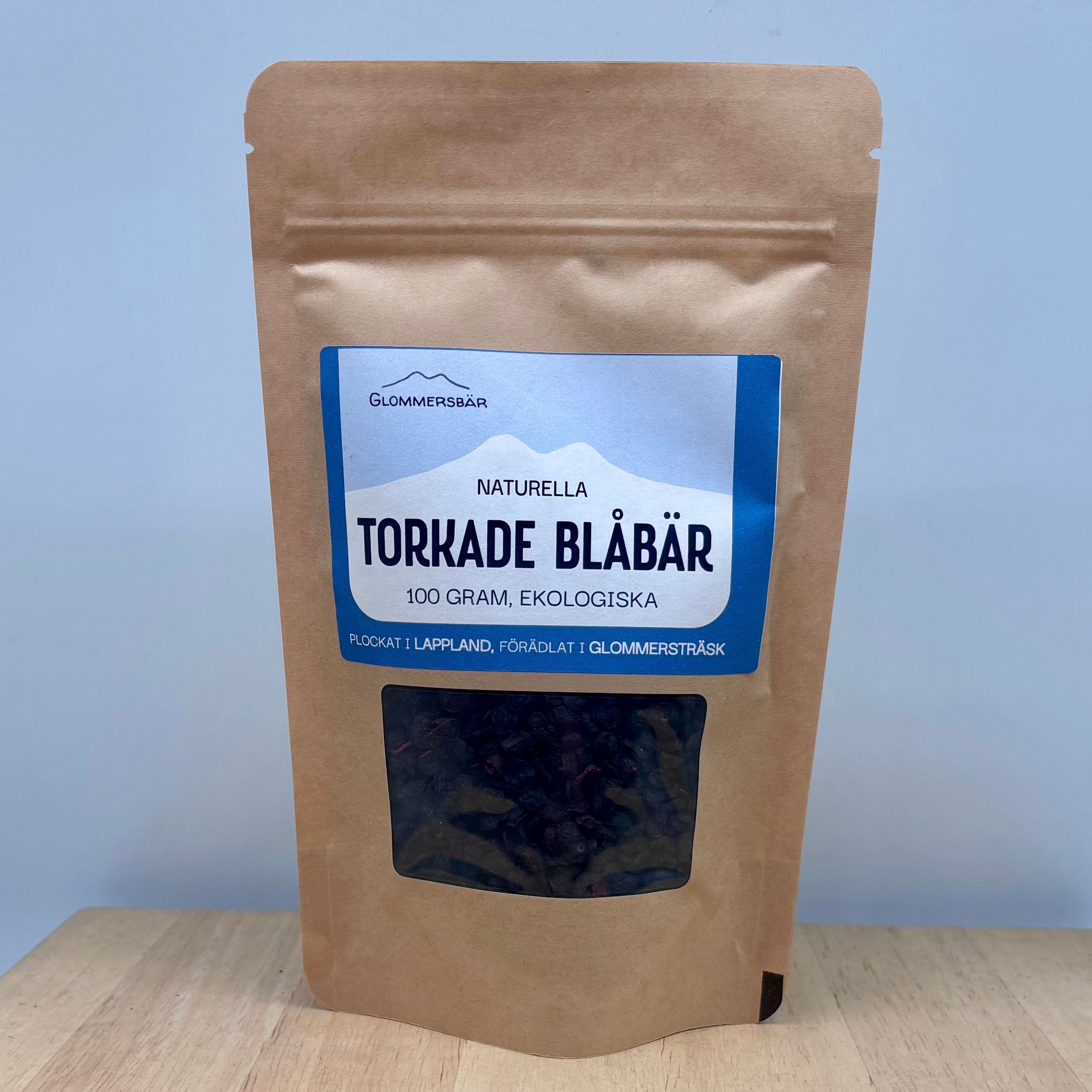 Torkade blåbär från Glommersbär i Glommersträsk. Torkade blåbär, helt utan tillsatser. Bären torkas varsamt i låg temperatur för att bevara de nyttiga ämnena. Blanda i müslin, ät som de är eller sätt smak på brödet eller gröten. 100g